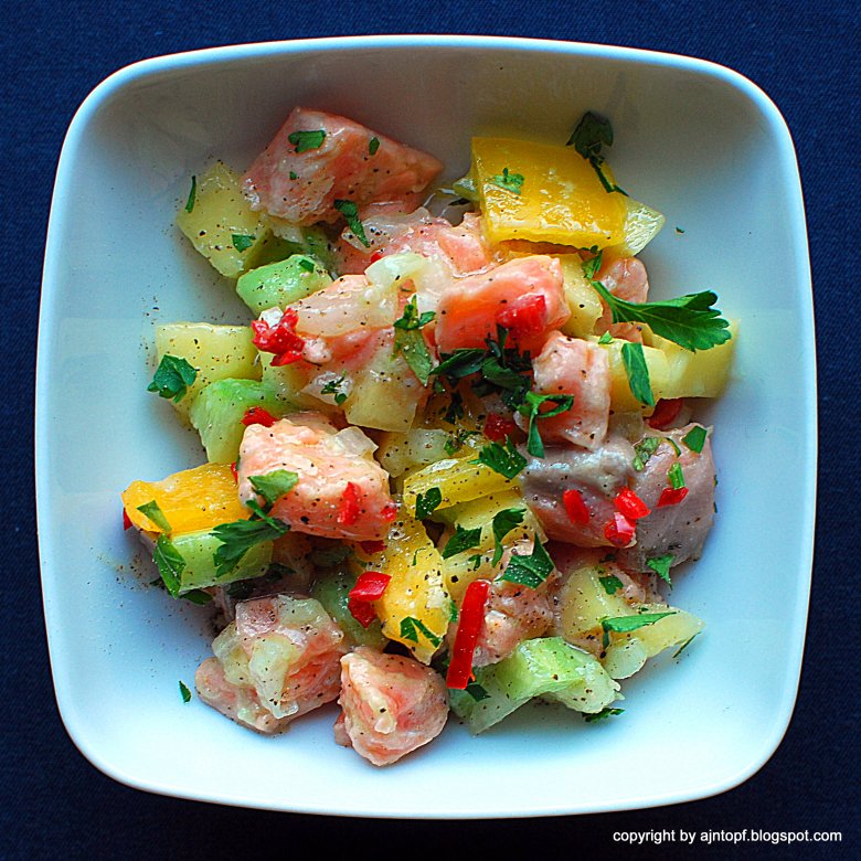 Ceviche z łososia z ogórkiem, awokado, papryką i mango